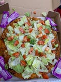 Lite layer pizza sauce, taco meat, cheddar cheese, lettuce, tomato, taco sauce on side