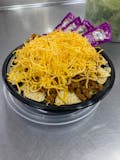 pizza sauce, taco meat, nacho chips, cheddar cheese, lettuce, tomato, taco sauce on side