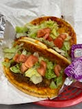 Taco meat, cheddar cheese, lettuce, tomato, taco sauce on side